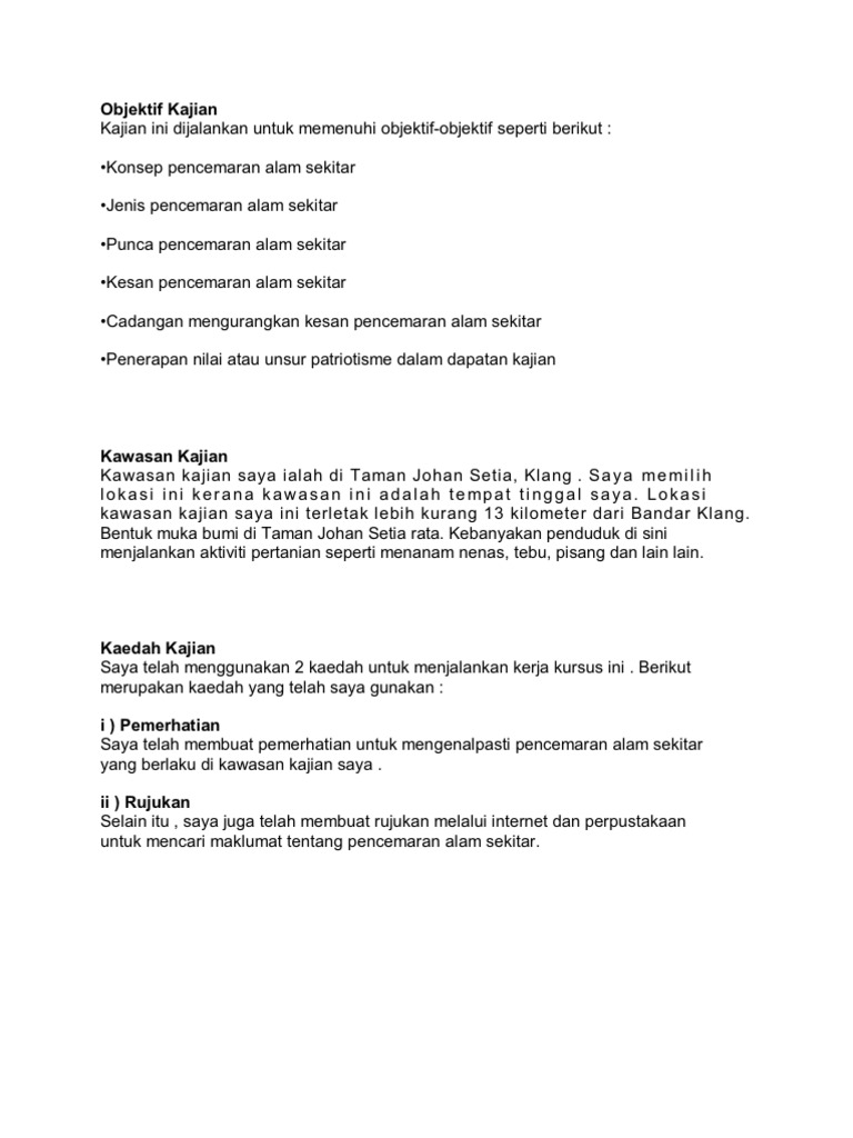 Folio Geografi 2 Doc Document from demo.vdokumen.net .menyata dan menghuraikan satu jenis pencemaran alam sekitar atau lebih di kawasan kajian sama ada udara, air, tanih, bunyi atau bau. Objektif kajian objektif kajian saya ialah mengkaji konsep pencemaran alam sekitar di kawasan ss 13 , subang jaya. Merujuk pada bahagian 1) konsep pencemaran. Tanah menjadi tidak subur dan menurun kualitasnya. Masalah alam sekitar seperti pemanasan global, pencemaran udara, pencemaran air dan kepupusan flora dan fauna semakin mendapat perhatian. 4091030 kajian geografi tempatan pencemaran alam sekitar1. Yoshinoya hanamaru malaysia sdn bhd yee yen tong sdn bhd yoong onn corporation berhad yick hoe ferrous steel sdn punca punca pencemaran alam sekitar. Data berhubung indeks pencemaran udara (ipu) dan status kualiti air sungai diperoleh daripada jabatan alam sekitar (jas), dari 1998 hingga 2014.